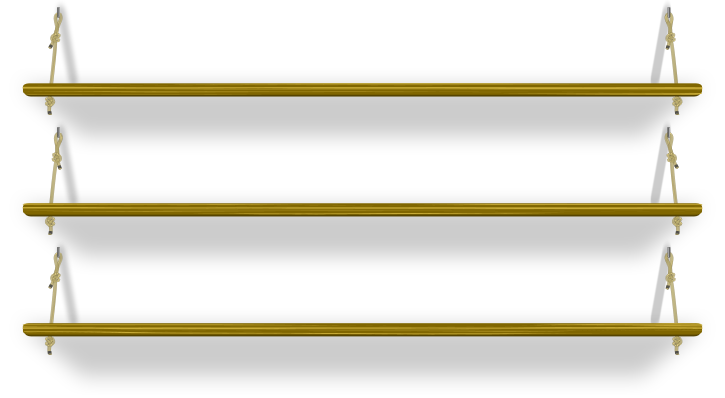 This features a white wall with three shelves hanging from it. Each shelf is made of wood and has a gold color, giving the display an elegant appearance. The shelves are arranged in a row, creating a visually appealing presentation. This setup could be used for various purposes such as displaying artwork or showcasing decorative items.