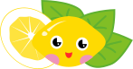 This features a cartoon lemon with a smiley face drawn on it. It is surrounded by three green leaves, which are placed to the right of the lemon. In addition to these elements, there is also a slice of lemon located on the left side of the image. This playful and colorful representation of a lemon adds a touch of whimsy to the scene.
