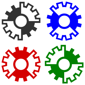 This features four different colored gears, each with a unique design. These gears are arranged in a square formation and are displayed prominently on the screen. Each of the four gears has a distinct color: red, blue, green, and yellow. They appear to be intricately designed and may represent various types of machinery or mechanical components. The arrangement of these gears creates an interesting visual display that showcases their unique characteristics.