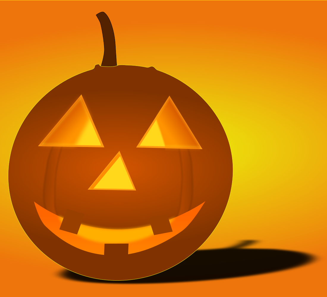This features a close-up of a carved pumpkin with a smiling face, placed in front of an orange background. The pumpkin is the main focus of the scene and appears to be the centerpiece of the composition. Its vibrant colors and intricate details make it stand out against the backdrop, creating a visually appealing image that captures the essence of Halloween festivities.