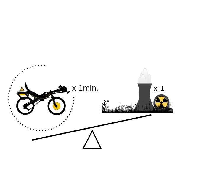 This features a bicycle on top of a scale, with the number "1 million" written next to it. This is an interesting juxtaposition between the bike and the nuclear power plant, which is represented by a small model in the background. The scale appears to be tipping towards the right side, indicating that the bicycle might be heavier than expected. The scene creates a thought-provoking contrast between human-powered transportation and the reliance on nuclear energy for large-scale power generation.