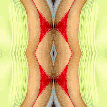 This features a unique and intricate design of red and white stripes, resembling the pattern on a bikini. This pattern is repeated multiple times throughout the scene, creating an interesting visual effect. The red and white colors are interspersed with other shades of green, adding depth to the overall composition. The image appears to be a close-up view of this eye-catching design, making it stand out as a captivating piece of art or decoration.