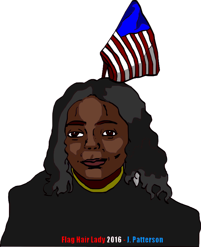 This features a woman with a flag in her hair, giving the appearance of having an American flag on her head. She is wearing a black shirt and has a smiling expression. The drawing itself is colorful and captures the essence of the scene. In the background, there are two other people visible, one to the left and another to the right side of the image.