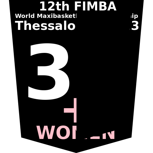 This is a black and white poster featuring the number three in pink. It appears to be an advertisement for a sports event, possibly related to basketball or volleyball. The number three is prominently displayed on the poster, with the rest of the poster being filled with text that reads "12th Fiba World Maxibasket Thessaloniki 3". This suggests that the event is taking place in Greece and is part of a larger sports competition.