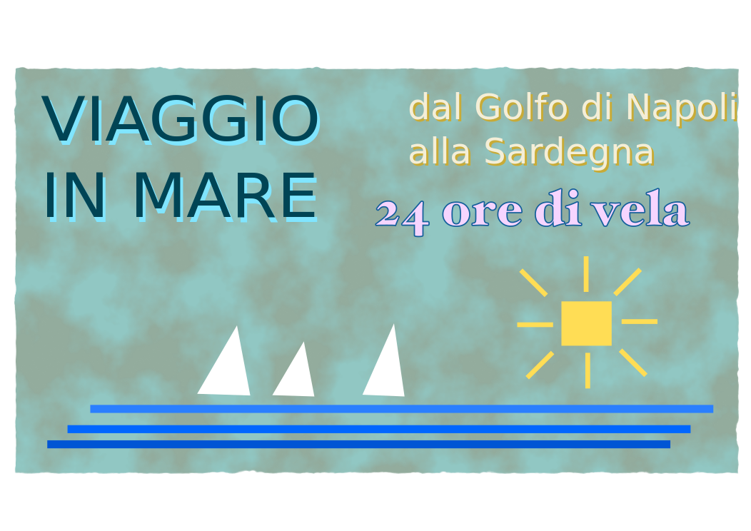 This is a colorful poster featuring a boat in the water with several sails. The boat appears to be sailing on a sunny day, as indicated by the bright yellow sun in the sky. The poster also has text written in Italian, which reads "Viaggio in mare alla Sardegna." This suggests that the image is related to travel or vacation, possibly featuring a trip to the coastal region of Sardigna.