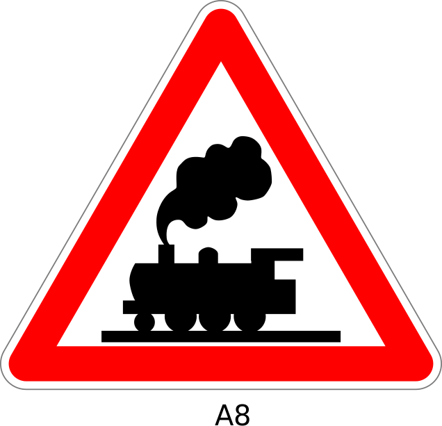 This features a red and black sign with the number A8 on it. The sign is shaped like a train, indicating that there might be a railway crossing nearby. The train appears to be moving down the tracks, as indicated by the smoke coming out of its engine. This sign serves as a warning for drivers to be cautious when approaching the railway crossing and to slow down if necessary.