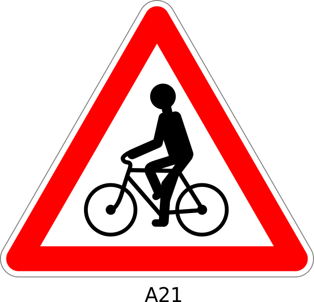 This features a red and white sign with an illustration of a person riding a bicycle. The cyclist is depicted in black, giving the impression that they are going downhill. The sign has the number "A21" written on it, indicating its location or purpose. The overall design of the sign suggests that it may be related to cycling safety or regulations for cyclists in the area.