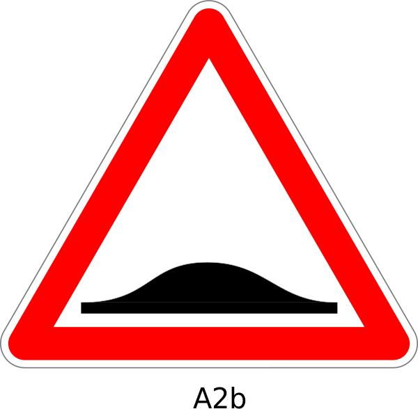 This features a red and white sign with the letters A, B, and C on it. It appears to be an arrow pointing upwards, possibly indicating a hill or incline in the area. The sign is placed against a white background, making it stand out clearly. This could be a road sign or a warning for drivers and pedestrians to be aware of the terrain ahead.