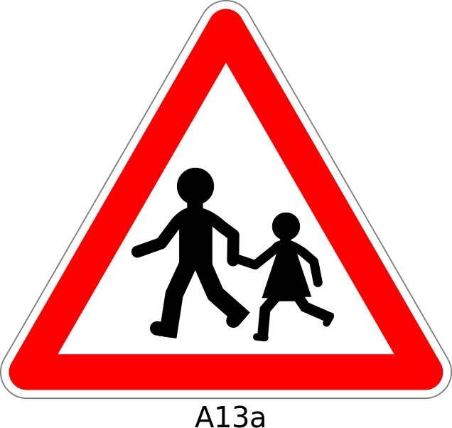 This features a red and white sign with two silhouettes of people walking together. One person is on the left side, while the other is on the right side of the sign. They are both holding hands as they walk, creating an impression of unity and companionship. The sign appears to be a warning or cautionary message for pedestrians in the area.