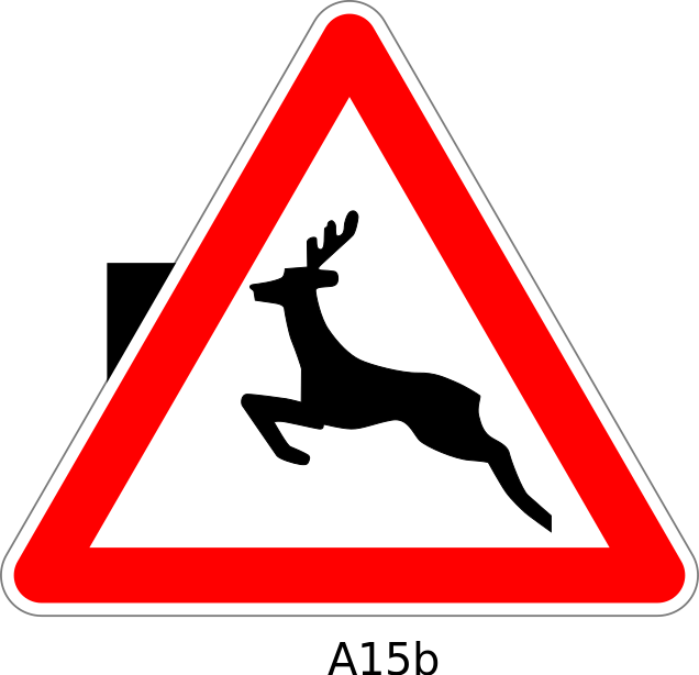 This features a red and white sign with the number 16 on it. Above the sign, there is an illustration of a deer running across the road. This sign is likely meant to warn drivers about wildlife crossing the area or to be cautious while driving in this location. The combination of the deer image and the number 16 suggests that this particular sign may have been placed at a specific location where such incidents have occurred, or it could simply be an artistic representation of the warning message.