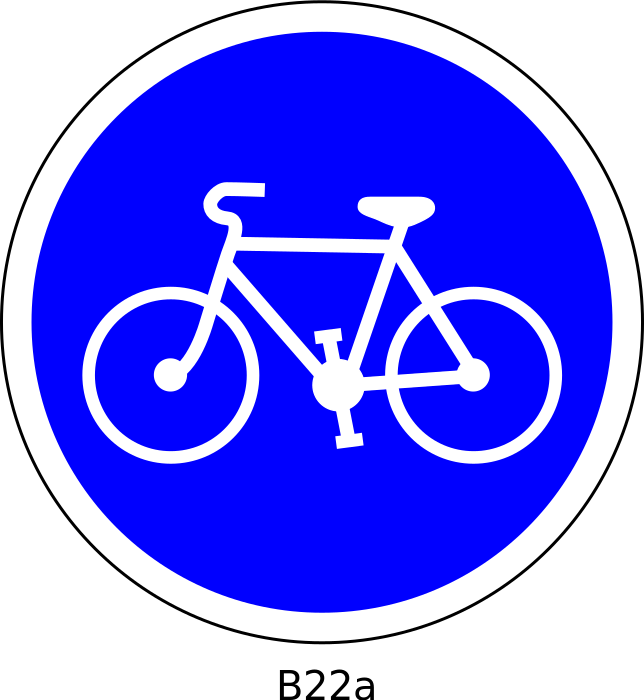 This features a blue and white sign with the word "bicycle" written on it. This sign is likely used to indicate that there are bicycle lanes or paths nearby, possibly for cyclists to use safely while traveling through the area. The sign's design is simple yet effective in conveying its intended message.