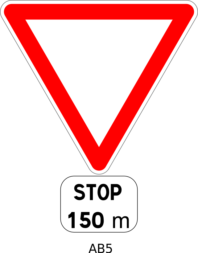 This features a red and white stop sign with the word "stop" written in black. The sign is placed on top of a white background, making it stand out clearly. The sign has a measurement of 150 meters below it, indicating that it is located at an intersection where vehicles must come to a complete stop before proceeding. This type of sign is commonly used in various countries around the world to ensure road safety and regulate traffic flow.