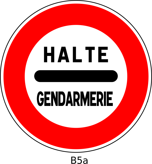 This features a red and white sign with the word "HALTE" written in black. Below this, there is another word that reads "Gendarmerie." This sign appears to be related to road safety or traffic regulations. The sign's design suggests it could be from France, as indicated by its color scheme and language.