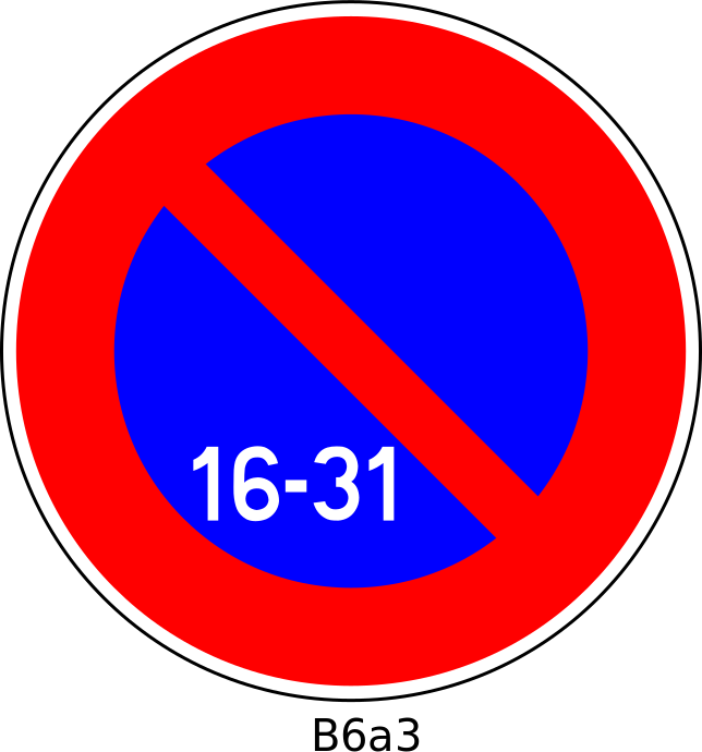 This features a red and blue circle with the number 16-31 written in white. This sign is likely a road or parking sign, indicating that it is not allowed to park there. The color scheme of red and blue gives the impression of a no parking zone.