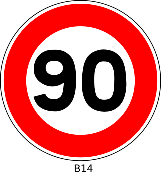 This features a red and white sign with the number 90 on it. The sign is round in shape, and its color scheme consists of red for the background and black for the numbers. It appears to be an official road sign, possibly indicating a speed limit or other traffic regulations. The sign's design suggests that it could be used in France, as it follows the country's standard for road signs.