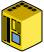 This features a yellow box with a blue square in the middle. This box appears to be a refrigerator, as it is described as such in various sentences. It has a handle on top and a door that can be opened or closed. The color scheme of the refrigerator consists of yellow for the exterior and blue for the square in the center.