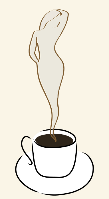 This features a cup of coffee with a woman's silhouette on the side. The woman is depicted in an artistic manner, giving the impression that she is massaging her own back. The cup itself has a handle and appears to be placed on a saucer. The overall scene gives off a relaxing atmosphere, as if one were enjoying a moment of self-care while sipping their coffee.