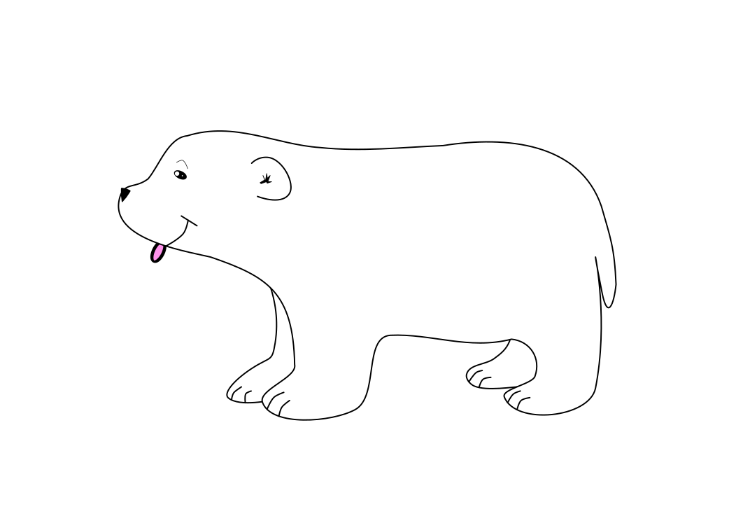 This features a white polar bear with a pink tongue sticking out of its mouth. It is walking across the screen, giving off an impression of being playful and curious. The drawing of the polar bear is done in black and white, which adds to the simplicity and elegance of the scene. The bear's body occupies most of the image, with its legs spread apart as it moves forward.