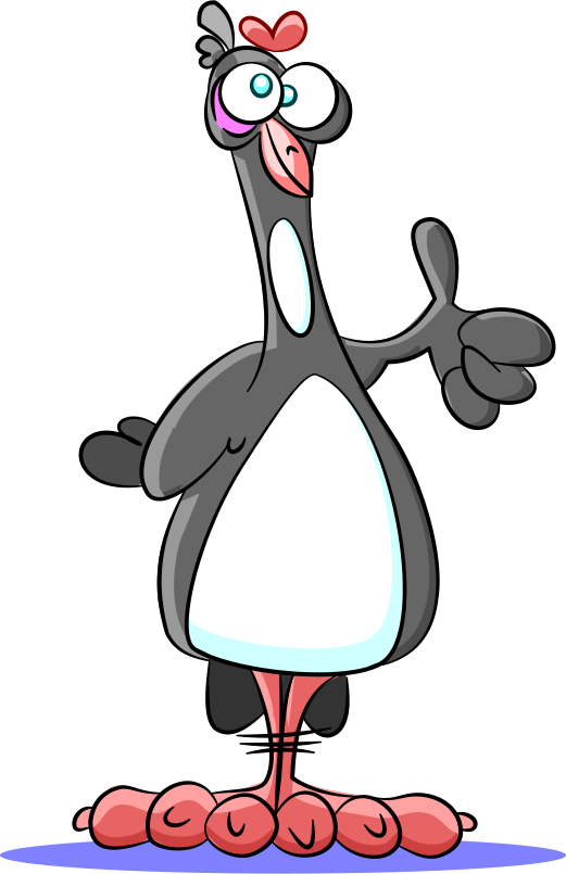 This features a cartoon penguin with an exaggerated body, giving the impression of being very large. It is standing on two oversized feet and has a big smile on its face as it gives a thumbs up gesture. The penguin's eyes are crossed, adding to its comical appearance. This whimsical character appears to be enjoying itself in this playful scene.