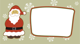 This features a Santa Claus figure standing next to a white frame with a green border. The Santa is wearing a red and black outfit, complete with a belt and boots. He appears to be holding the frame in his hand, possibly ready to hang it on the wall or display it as part of a holiday decoration. The scene gives off a festive atmosphere, likely associated with Christmas time.