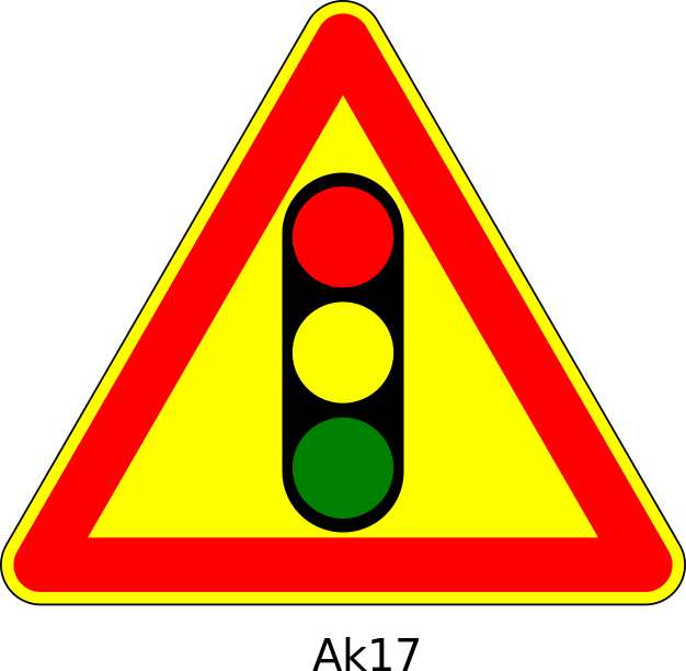 This features a red and yellow traffic sign with the number 17 on it. The sign is placed in front of a stoplight, which has three lights: one green light, one orange light, and one red light. The colors of the sign are predominantly yellow and red, making it stand out against its surroundings.