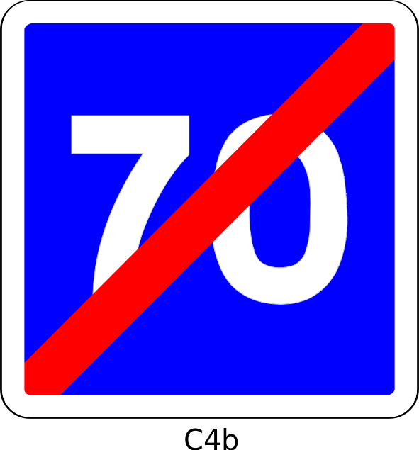 This features a blue and red sign with the number 70 written on it. The sign is accompanied by a red circle, which indicates that the number 70 is not allowed or restricted in some way. This could be a traffic regulation or a warning to drivers about certain conditions they need to follow. The combination of colors and the presence of the circle make this sign easily recognizable for those who see it on the road.