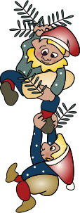 This features two cartoon characters, likely elves or Santa's helpers, climbing a tree. They are both wearing festive hats and appear to be enjoying themselves as they playfully interact with each other. One of the characters is holding onto another character who is also climbing the tree, creating an amusing scene. The overall atmosphere of the image suggests a lighthearted holiday celebration or a fun winter activity for these two charming figures.