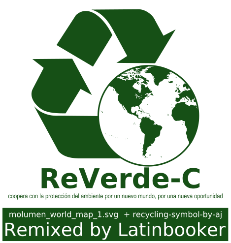This is a green and white logo that has been remixed to promote recycling, reusing, and reducing waste. It features a large green circle with the word "ReVerde-C!" written in it. Inside the circle, there is an illustration of the Earth, emphasizing the importance of protecting our planet. The logo also includes text in Spanish, indicating that it is meant to be used by people who speak this language. Overall, the image conveys a message about environmental responsibility and the need for individuals to take action to preserve the planet.