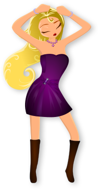 This features a cartoon woman with blonde hair, wearing a purple dress and knee high boots. She is striking a pose with her hands in the air, giving off an elegant and confident vibe. Her outfit consists of a short skirt that accentuates her figure, while the boots add a touch of sophistication to her overall look. The cartoon style adds a playful and whimsical element to the scene, making it visually appealing and engaging for viewers.