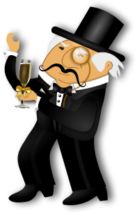 This features a man dressed in a black suit and top hat, wearing a monocle on one eye. He is holding a glass of champagne in his hand, giving the impression that he might be attending a formal event or celebration. His outfit suggests a sense of sophistication and elegance, while the monocle adds an element of humor and eccentricity to his appearance. The man's pose also indicates that he is enjoying himself at this social gathering, as he holds up the glass in a gesture of celebration or camaraderie with others around him.