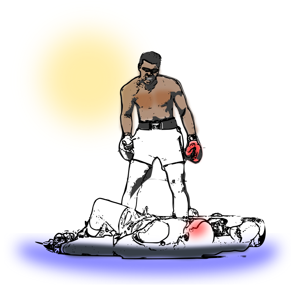 This features a cartoon drawing of boxer Muhammad Ali standing over two people lying on the ground. One person is lying face down, while the other is lying face up. Both individuals appear to be in distress or possibly injured. The scene takes place outdoors with sunlight shining brightly, creating an atmosphere of warmth and energy. The cartoon drawing captures the essence of the iconic boxer's presence and influence on those around him.