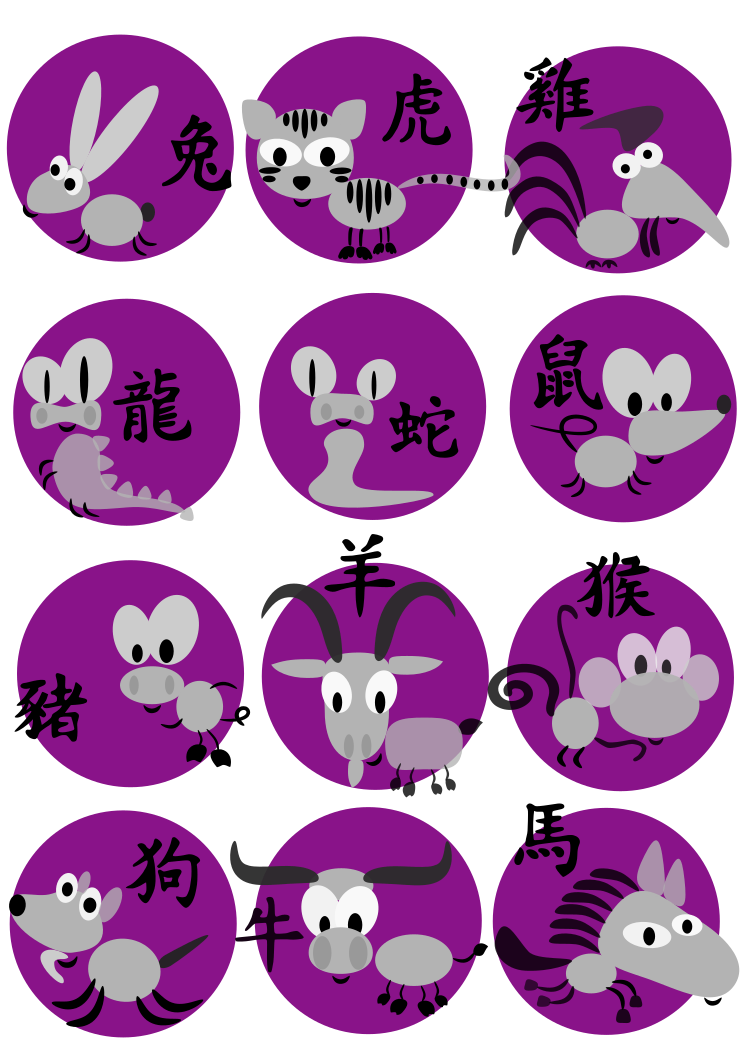 Tags: animal, chinese, dog, dragon, goat, horoscope, horse, monkey, ox, pig, rabbit, rat, rooster, snake, tiger, vector, asian, cartoon, drawing, illustration, japanese, manga, painted, purple, round, symbol