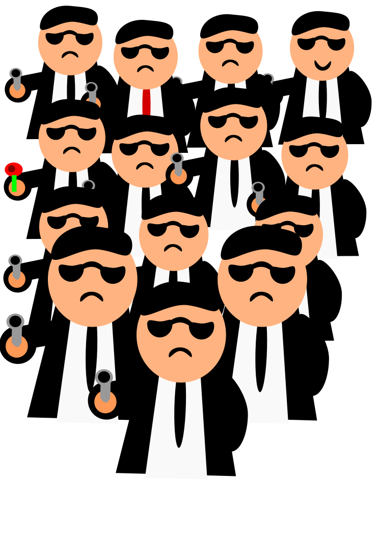 This features a large group of cartoon men dressed in suits and sunglasses, all holding guns. There are at least 13 people visible in the scene, each with their own unique facial expression. Some of them appear to be frowning or making faces, while others seem more neutral. The men are positioned throughout the image, with some standing closer together and others spaced further apart. The guns held by these cartoon characters vary in size and shape, adding a sense of diversity to the scene. There is also a tie visible among the group, likely belonging to one of the men dressed in suits. The overall composition of the image creates an interesting contrast between the seriousness of the gun-holding characters and their playful cartoon appearance.