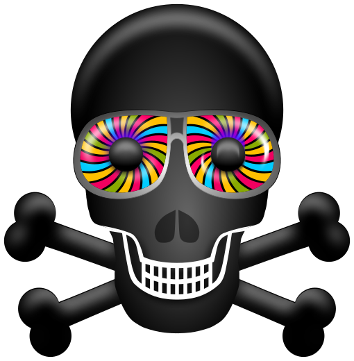 This features a skull and crossbones wearing sunglasses with brightly colored swirls inside of them. The skull is black, and the glasses are placed on top of it, giving the impression that they are part of the skull's head. The colors used for the swirls include pink, yellow, blue, green, and red, creating a vibrant and eye-catching appearance. This unique design adds an interesting twist to the classic skull and crossbones symbol.