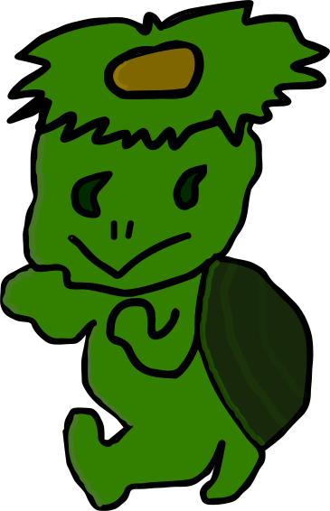 This features a colorful cartoon drawing of a turtle, possibly inspired by the Japanese kappa character. The turtle is depicted with green skin and wearing a hat that resembles a shell. It appears to be running or walking in an open area, giving it a dynamic and playful appearance. The overall design of the image showcases creativity and artistic expression through the use of vibrant colors and unique character design.
