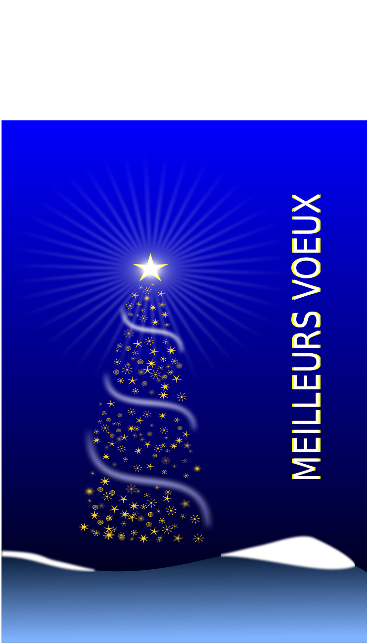 This features a beautifully decorated Christmas tree with a star on top, standing in front of a snowy mountain. The tree is adorned with many lights and ornaments, creating a festive atmosphere. The scene appears to be set against a blue sky, adding to the overall charm of the picture. The image is written in French, indicating that it may have been taken or created in France or by someone who speaks French.