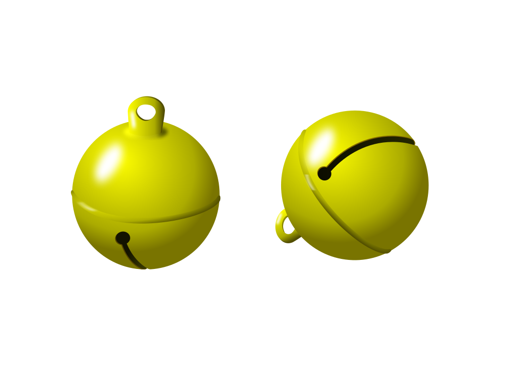 This features two small, round, yellow jingle bells with a hole in the center. They are positioned next to each other and appear to be made of metal or plastic. These bells have a simple design and seem to be hanging from a string or attached to an object. Their bright color and unique shape make them stand out against any background, adding a touch of playfulness and charm to the scene.