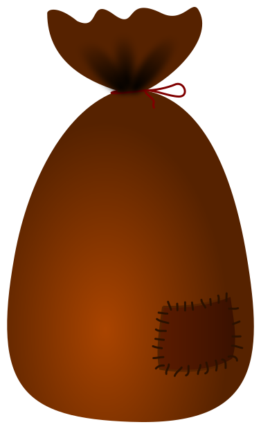 This features a brown bag with a hole in it, giving the appearance of a patch. The bag is tied off with a red ribbon, adding a touch of color to the scene. The overall design gives an impression of a worn or damaged bag that has been repaired with a new piece of fabric. This unique combination of colors and textures creates a visually interesting image that captures attention.