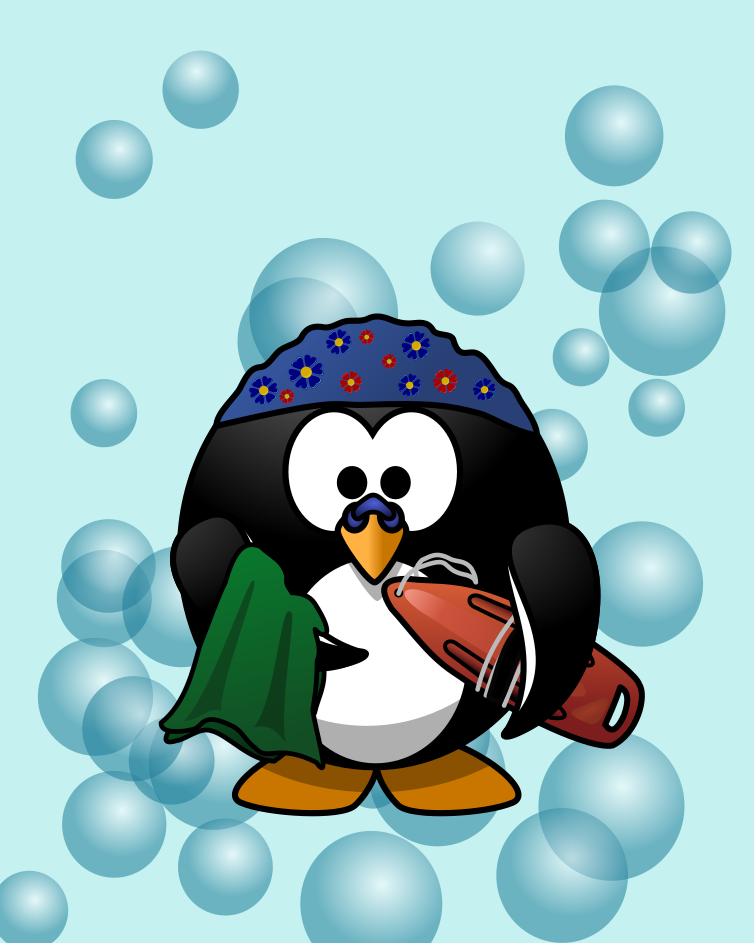 This features a cartoon penguin standing on a blue background with bubbles surrounding it. The penguin is wearing a hat, towel, nose clip, and floaty, giving the impression that it's ready for swimming or other water-related activities. The penguin appears to be the main focus of the image, occupying most of the frame with its distinctive features and accessories.