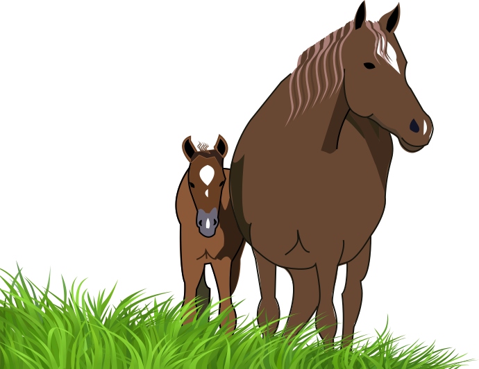 This features a large brown horse standing next to a smaller, younger brown horse. They are both in an open field with grass around them. The adult horse appears to be the mother of the foal, as they stand close together and share a bonding moment. The scene captures the beauty of nature and the connection between animals, particularly between a parent and its offspring.