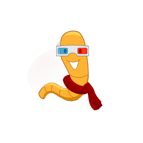 This features a cartoon character, possibly a worm or an eggplant, wearing 3D glasses and a red scarf. The character appears to be smiling as it is depicted in the foreground of the scene. The overall composition of the image gives off a playful and fun vibe, with the character's unique appearance and accessories adding to its charm.