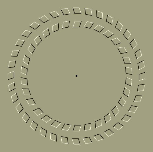 This features a large circle with a black dot in the center. The circle is made up of smaller circles, creating an intricate pattern that fills the entire frame. The black dot appears to be at the center of attention and serves as a focal point for the viewer. As one moves closer or further away from the image, the perspective on the black dot changes, making it seem like it is spinning. This creates an illusion of movement in the otherwise static scene.