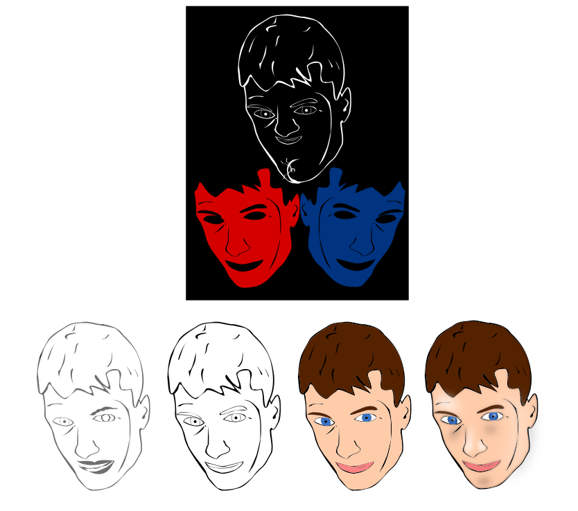 This features a collage of four different colored cartoon faces, each with distinctive facial expressions. These faces are placed side by side on the same picture, creating an interesting visual effect. The colors used for these faces include red, blue, and two shades of brown. Each face is unique in its appearance, showcasing a variety of emotions and styles. Overall, this image presents a creative and engaging display of cartoon characters.