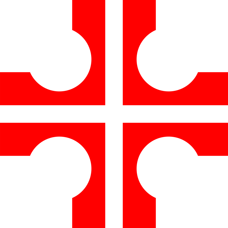 This features a red and white cross, which is a symbol of Christianity. The cross has four distinct sections, each with a different shape and design. These shapes include circles, triangles, and squares, creating an interesting visual effect. The cross appears to be the central focus of the image, drawing attention to its unique design elements.