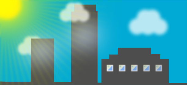 This features a cityscape with tall buildings and a sunny sky. There are four prominent skyscrapers in the scene, one on the left side, two in the middle, and another on the right side of the image. A large building is also visible in the background, adding to the urban atmosphere. The sunlight shines brightly over the cityscape, creating a warm and inviting ambiance.