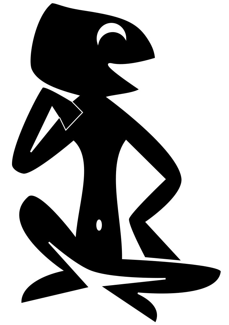 This features a black and white drawing of a person, possibly a monkey or an anthropomorphic figure, sitting on the ground with their hands behind their head. The figure appears to be wearing a tie, giving it a more formal appearance. The overall composition of the drawing is simple yet captivating, as it showcases the unique style and character of the person or creature in question.