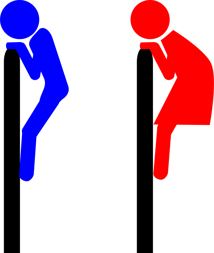 This features two people sitting on a pole, one in blue and the other in red. They are both positioned at different heights, with the blue person being higher up and the red person lower down. Both individuals appear to be enjoying their time together while seated on this unique piece of furniture. The scene is set against a white background that provides a clean and minimalist appearance.