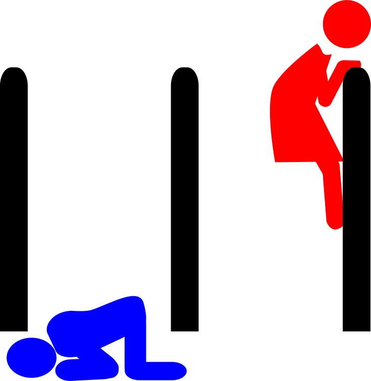 This features a woman standing on top of a pole, with her legs spread apart. She appears to be looking down at another person who is kneeling below her. This second person has their head bowed and seems to be in a submissive position. The scene takes place in an area where there are multiple poles, some of which have people standing on them. Overall, the image conveys a sense of dominance or power dynamics between the two individuals.
