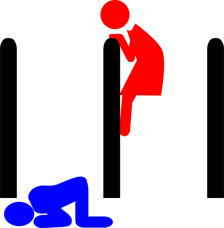 This features a person in red and blue colors, with the red figure sitting on top of a white wall. The blue figure is kneeling down next to the red one, creating an interesting contrast between the two characters. They are both positioned near a set of stairs, which adds depth to the scene. The overall composition of the image suggests that it might be related to a bathroom or public space setting, with the figures possibly representing different stages of using the facilities.