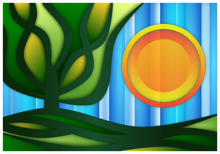 This features a beautifully illustrated scene of a tree with green leaves and branches, standing in front of a blue sky. In the background, there is an orange sun that appears to be rising or setting, creating a warm atmosphere. The tree is situated on a wavy field of grass, adding depth and texture to the overall composition. This artistic representation captures the essence of nature and its connection with the elements, making it an appealing visual experience for viewers.